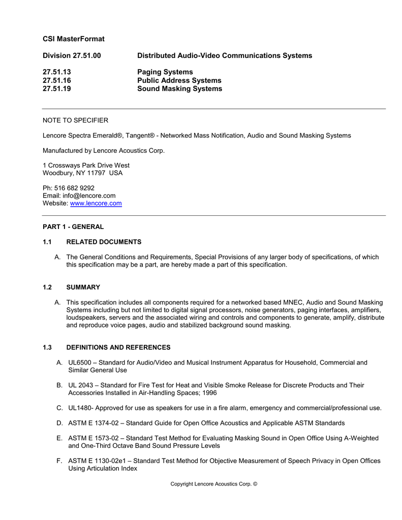 Csi Masterformat Division 27 51 00 Distributed Audio Video