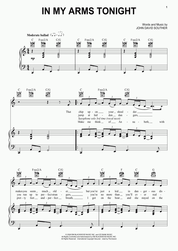 J D Souther In My Arms Tonight Sheet Music Pdf Notes Chords